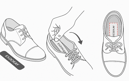 - Install the strip: Place one ESDOKAY applicator strip per shoe UNDER the insole, centered laterally. Start from the middle of the heel, keeping the strip as far from the edges as possible.